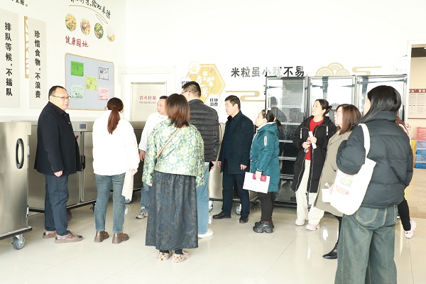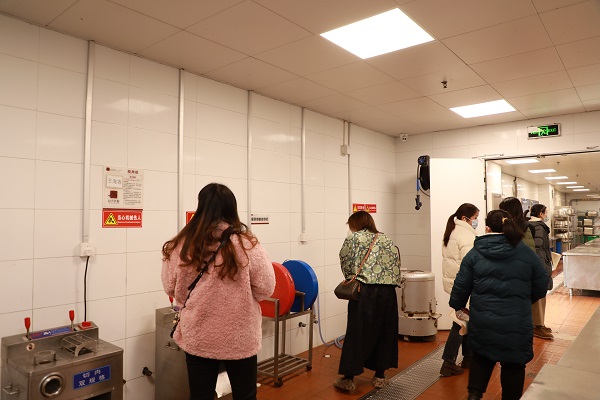 会议结束后,膳食管理委员会成员走进食堂后厨,进行实地探访。从食材储存区到烹饪操作间,委员们逐一查看各环节管理细节。进入加工间,委员们注意到生熟食砧板、刀具严格分色使用,消毒间内,餐具经“一刮二洗三冲四消”标准化流程后,整齐码放于高温消毒柜中。委员代表王女士感叹:“食材分类清晰、台账一目了然,连调味料都标注了开封日期,管理比想象中更细致!”此次后厨探访不仅让委员们直观感受到学校对食品安全的重视,也为后续优化管理提供了新思路。